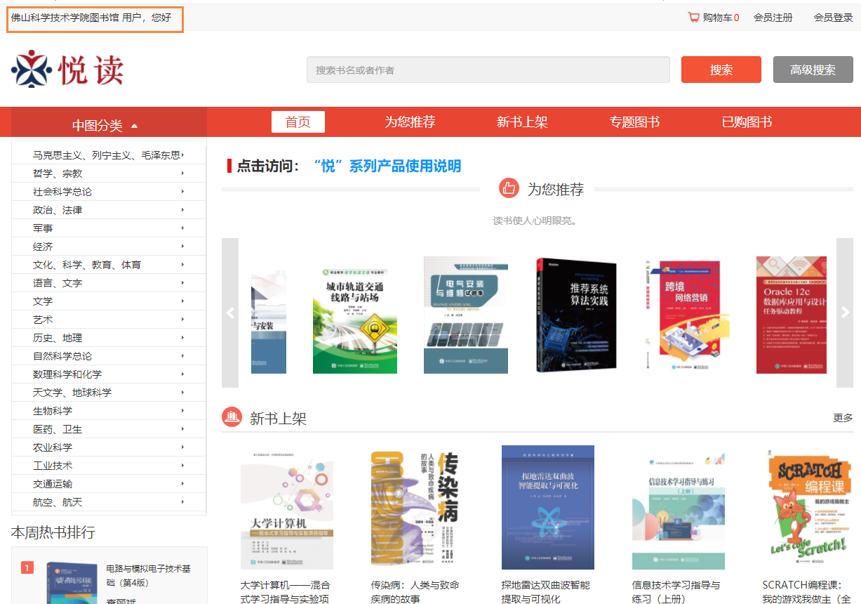 3.首页展示中图分类、为您推荐、新书上架、专题图书、已购图书导航。专题图书为悦读分类,分为科技、教育、经济管理、大众等图书。